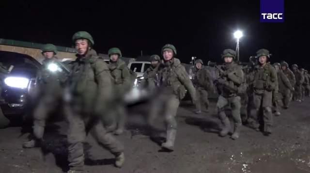 朝鲜士兵身穿俄罗斯军装、手持步枪在夜间行进